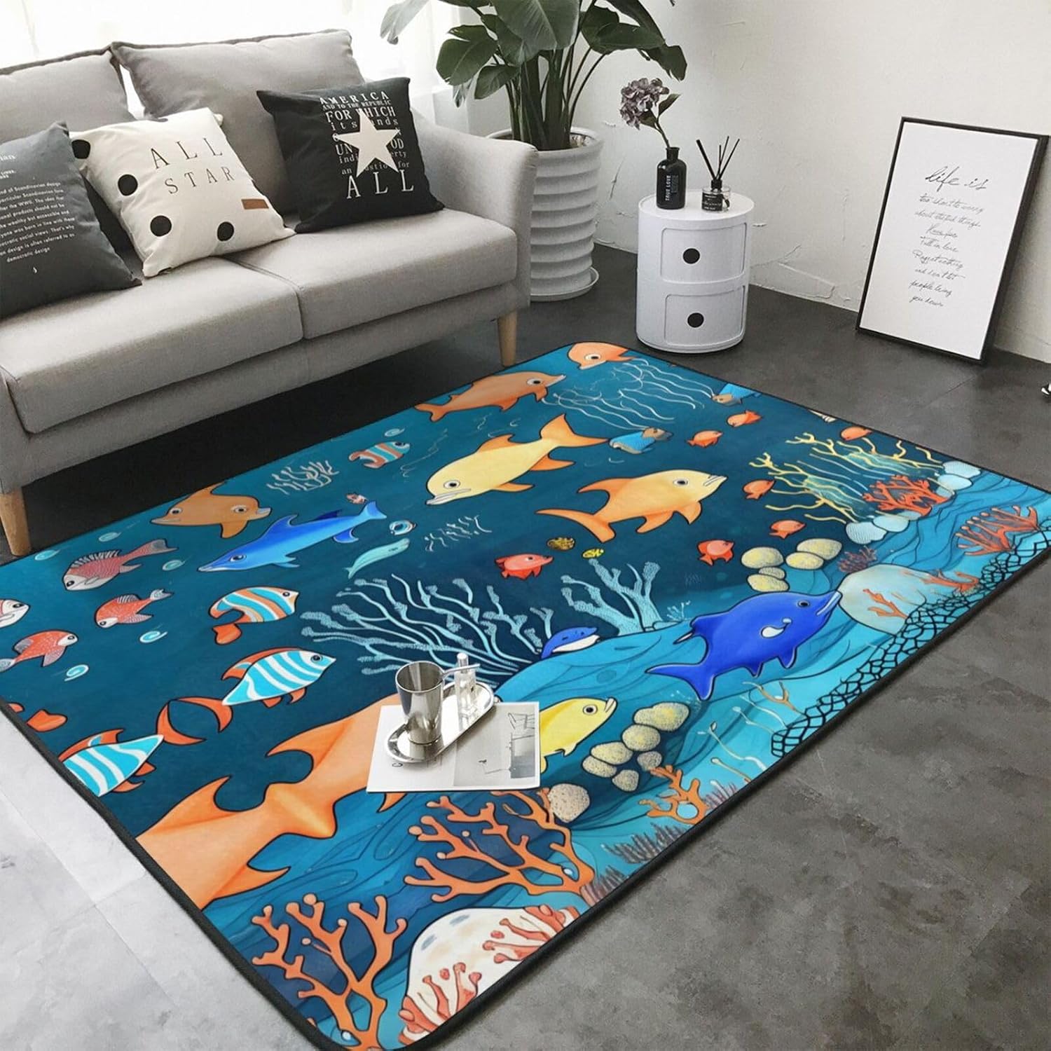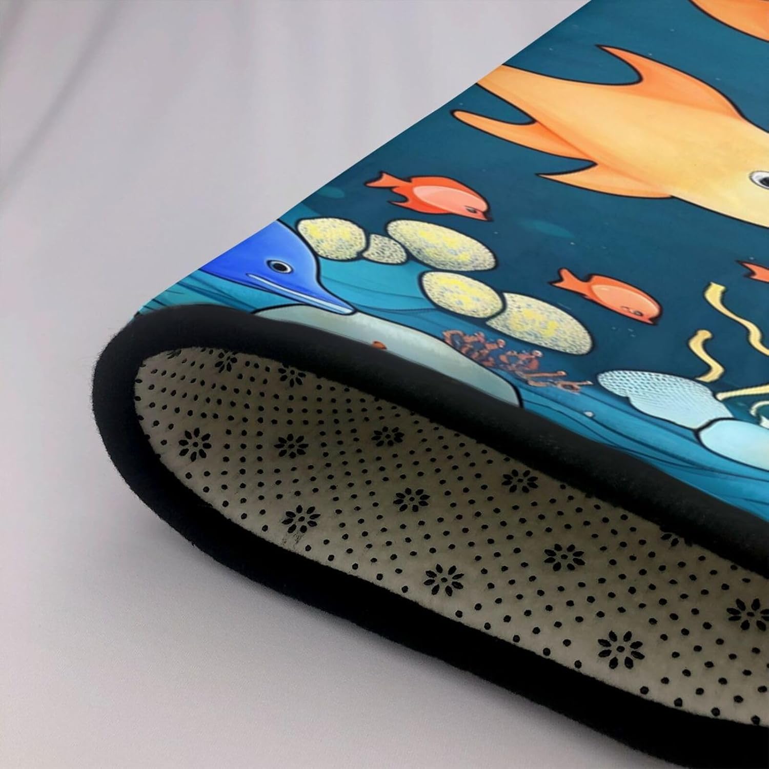 This Blue underwater world of fish printed decorative carpet is made of polyester flannel, which is delicate and soft to the touch, with tight and regular pile. It will not pill or fade after long-term use, and will always look like new. The middle layer uses high-density memory foam, which can automatically adjust according to the foot shape and pressure, providing precise massage for tired feet and relieving fatigue. The bottom is designed with non-slip plastic bottom non-woven fabric, which can firmly grip the ground even when it encounters water or on smooth surfaces, ensuring the safety of the elderly and children. It is easy to clean daily, can be machine washed or hand washed, and is wear-resistant and does not shed. Exquisite stitching technology and high-quality tailoring, with smooth edges, are suitable for a variety of scenes such as bathrooms, living rooms, and bedrooms. Non-slip, comfortable, and durable, adding a touch of intimacy and elegance to your life.
