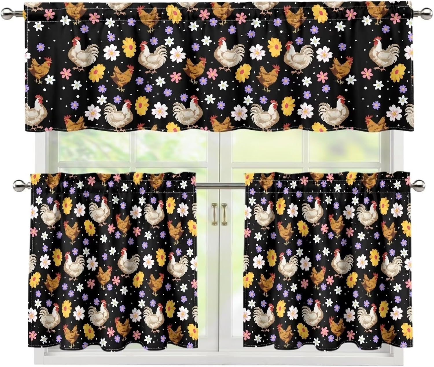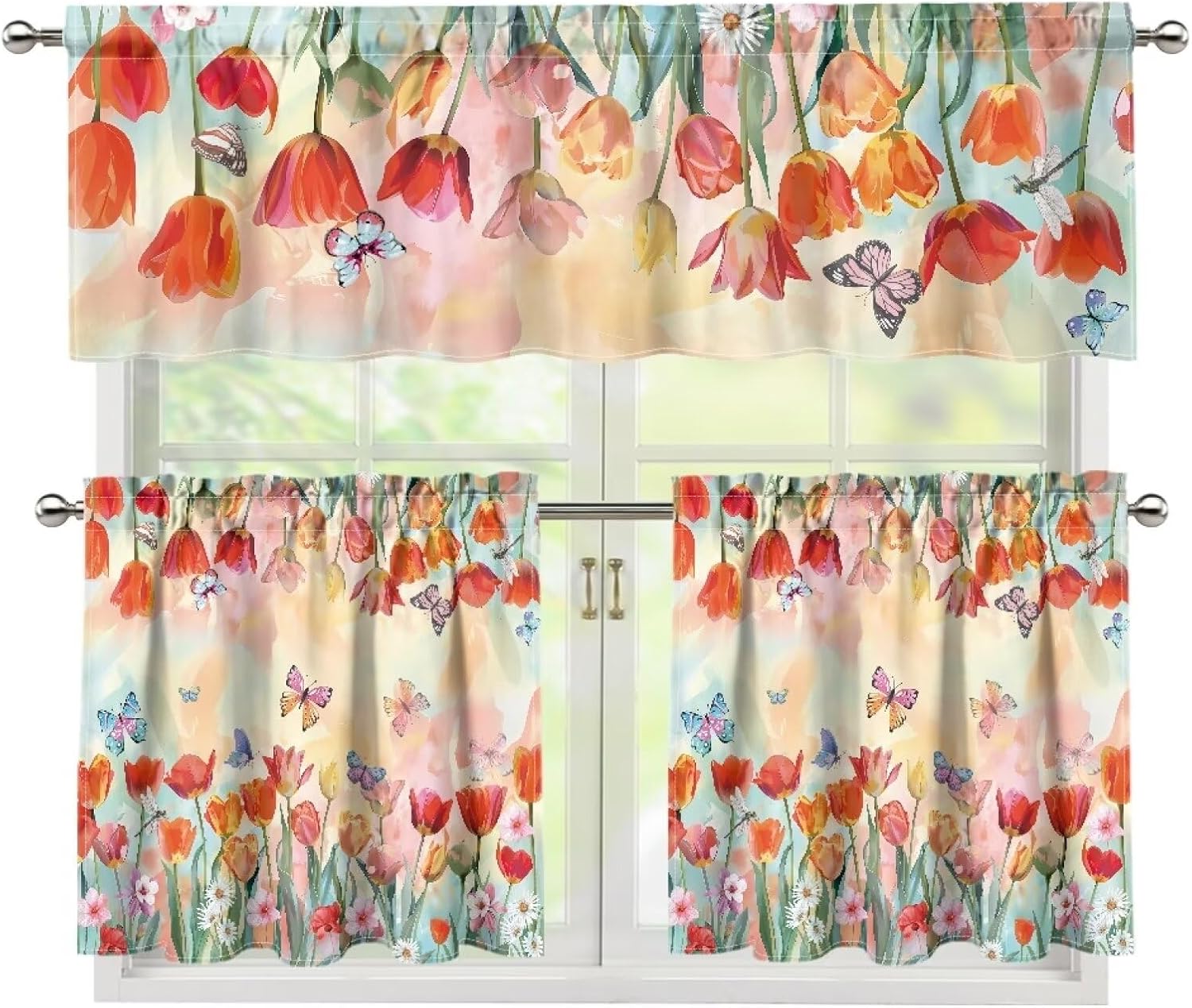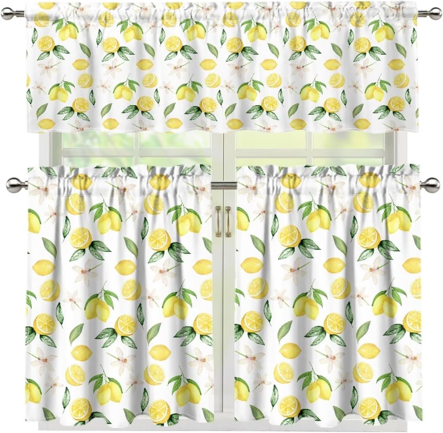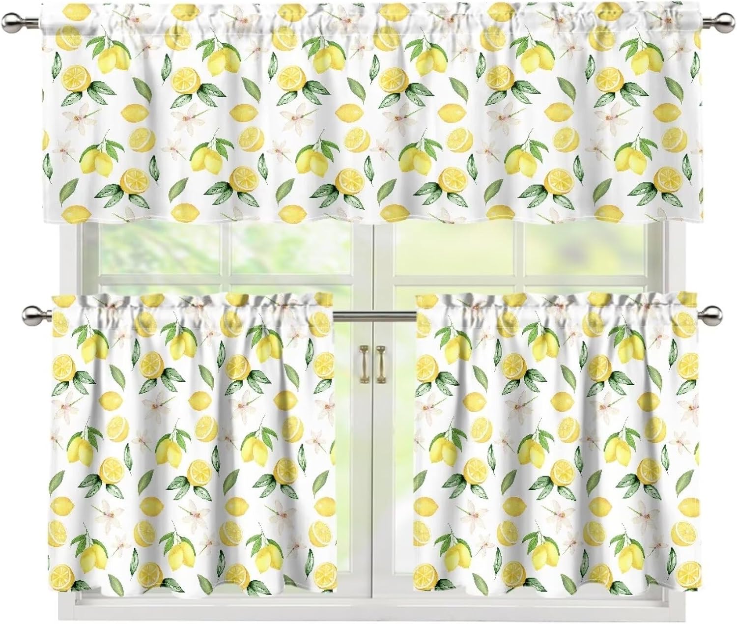 HUISEFOR Kitchen Curtains Valances and Tiers Set -Package Contents: 3-piece kitchen curtain valance each panel includes 1pc 53.9" W x 17.7" L curtain valance panel and 2pcs 27.5"W x 24"L (S) / 27.5"W x 35.8"L (M) short tiers curtain. -Made of high quality polyester.This material is soft to the touch and fade resistant, protect your furniture and floor from being damaged by the sunlight, and protect your privacy. Your space can be kept light and airy while you can enjoy your own activities in the living room without being disturbed by glances. -Easy Installation: The rod pocket is wide enough to fit most curtain rods on the market (Rods not included). It can easily cover your curtain rod, and is easy to install, slide and remove, 3 piece design makes installation and removal more convenient.