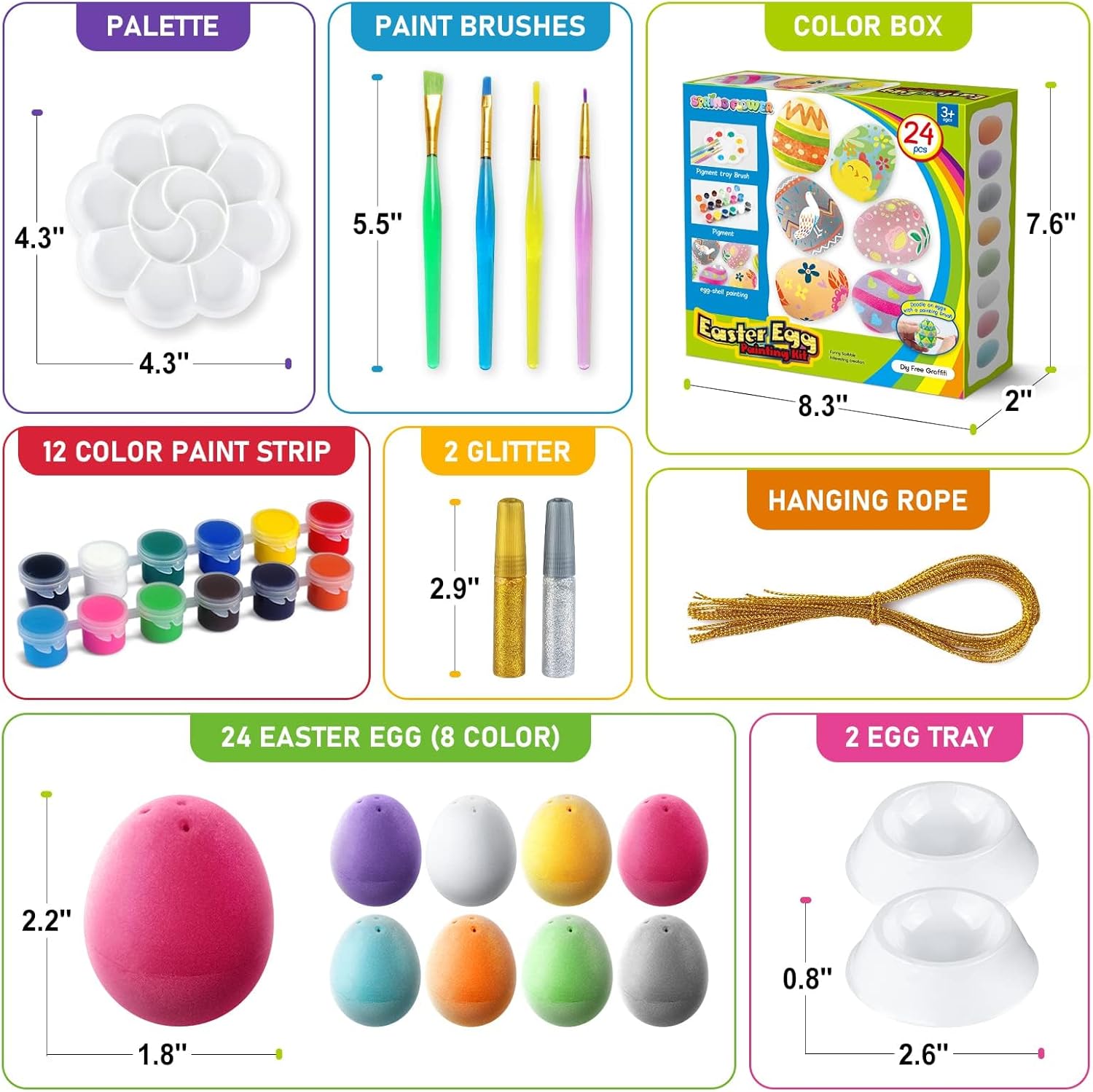 | Included Components | 24 Colorful Eggs(Eggs can be open for Easter toys filled) with 2 paint strips(12 colors), 4 paint brushes,2 glitters(gold & silver), 2 plastic egg trays,1 paint palette for DIY design, personalization, and painting. 24 hanging ropes |
