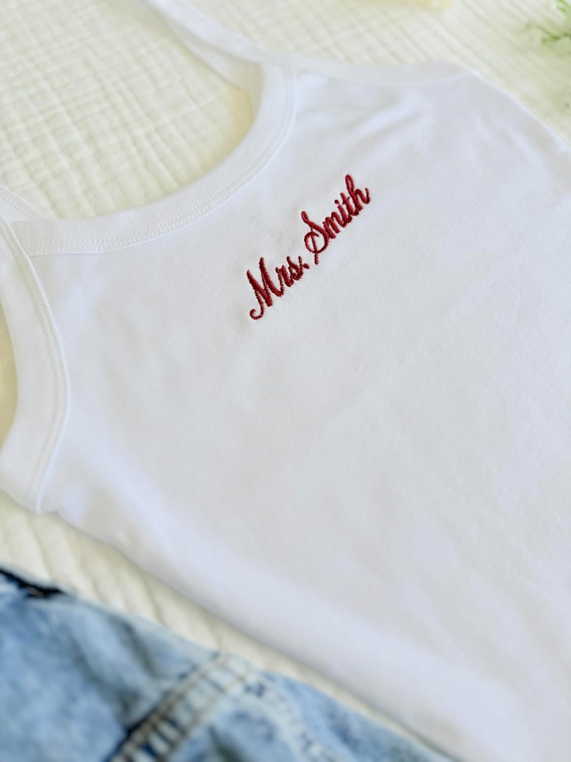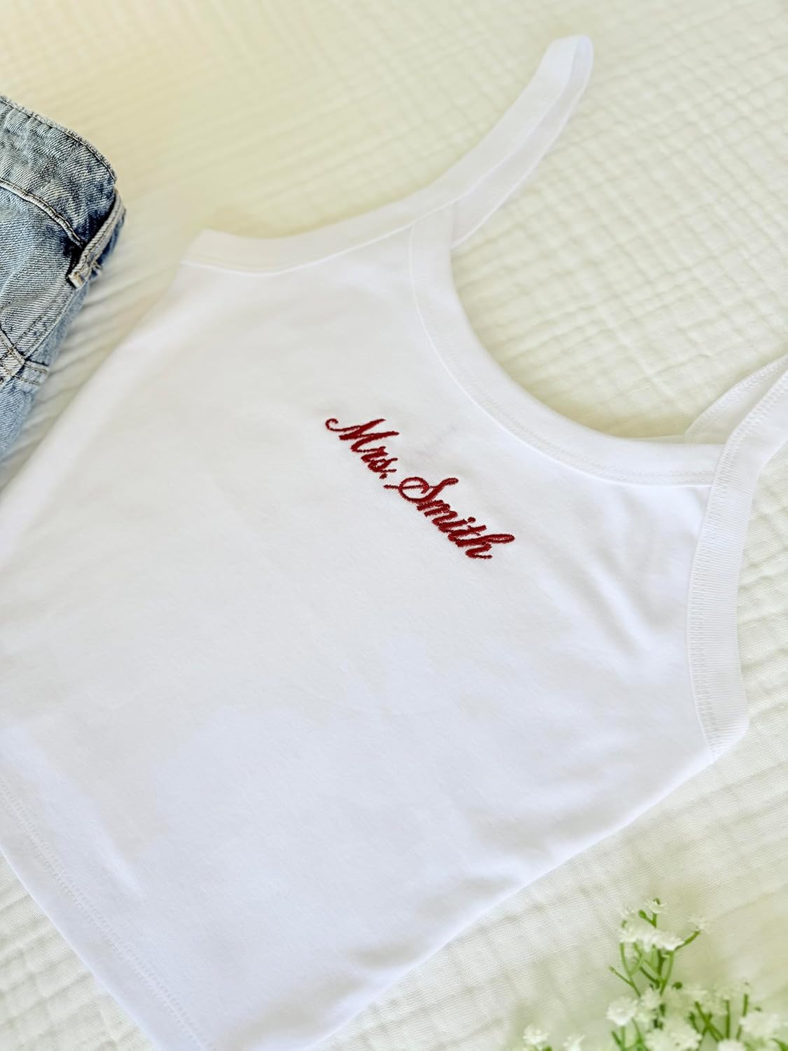 Make your bridal journey special with this charming spaghetti strap tank top featuring elegant embroidered 'Mrs.' lettering. Perfect for the bride-to-be, this white tank top combines style and comfort with its classic design and soft fabric construction. The delicate spaghetti straps offer a feminine touch while maintaining a comfortable fit that's ideal for various pre-wedding celebrations. Whether you're preparing for your bridal shower, honeymoon, or just want to celebrate your upcoming nuptials, this tank makes a wonderful addition to your wardrobe. The versatile design allows for easy pairing with shorts, skirts, or loungewear, making it suitable for multiple occasions. This thoughtful piece serves as an ideal engagement or bridal shower gift that any future Mrs. would cherish. The tank top features quality stitching and durable construction to maintain its shape and appearance through multiple wears. Available in crisp white with striking embroidery, this tank top lets you showcase your bride-to-be status with elegance and style.