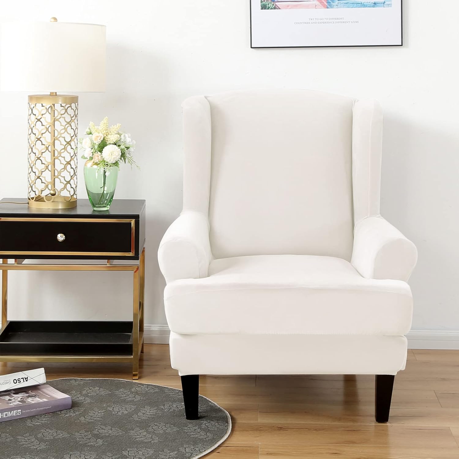 MIFXIN wingback chair covers use special and careful craft to ensure the cover fit your furniture greater. Suitable for T cushion and Box cushion styles. The extra fabric of the wing back chair cover can be stuffed under the seat cushion. The elastic is free-floating inside the hem of the cover to allow you to adjust fullness around the perimeter of your furniture. These beautiful protective wing-back chair covers save you money by extending the life of your armchair sofa, make your old furniture appear brand new.FeatureReal Velvet Fabric: Soft and rich-looking velvet fabric, give you great hand-feeling, white protecting your skin as well as you children.2-Piece Separate Slipcover: Wingback chair slipcovers have 2 pieces, cushion cover and sofa cover is separated.Usual Design: One size, fit for more than 90% wing back chairs, please measure your chair first in case of unfit.Great Fit Wingback Chairs Size:Backrest width: 37.4 to 43.3 inch / 95 to 110 cmBackrest width: 27.5 to 31.5 inch / 70 to 80 cmChair width: 31.5 to 36.2 inch /80 to 92cmPackage Include1 x Chair Base Cover1 x T-Cushion CoverWarm Tips-Do not use bleach and pls wash it with same/similar colors.-Manual measurement 1-4cm error is allowable.-Due to the light, computer screen resolution is different individually when customer looking at the items, the colors showed in screen may be a little different from the actual items.