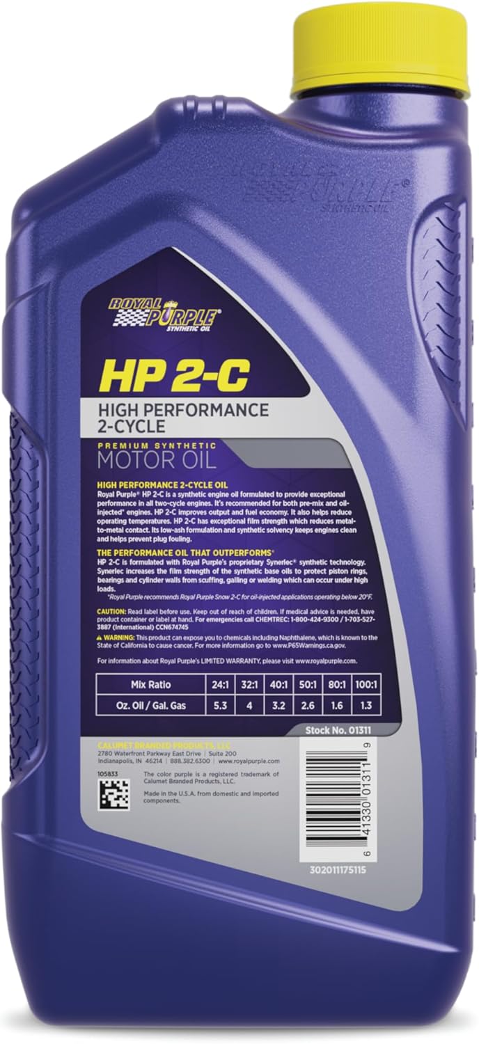 Royal Purple XPR 2-C (formerly 2-Cycle TCW III Racing) is specifically formulated for use in pre-mix gasoline 2-cycle racing applications. Royal Purple XPR 2-C increases horsepower and torque and reduces heat and wear to maximize performance in high performance 2-cycle gasoline engines. XPR 2-C has a synthetic solvency that keeps spark plugs and exhaust ports clean for maximum engine efficiency. This engine cleanliness, combined with XPR 2-C's low coefficient of friction promotes increased horsepower and engine speed. Royal Purple does not recommend using with stock oil injection systems.