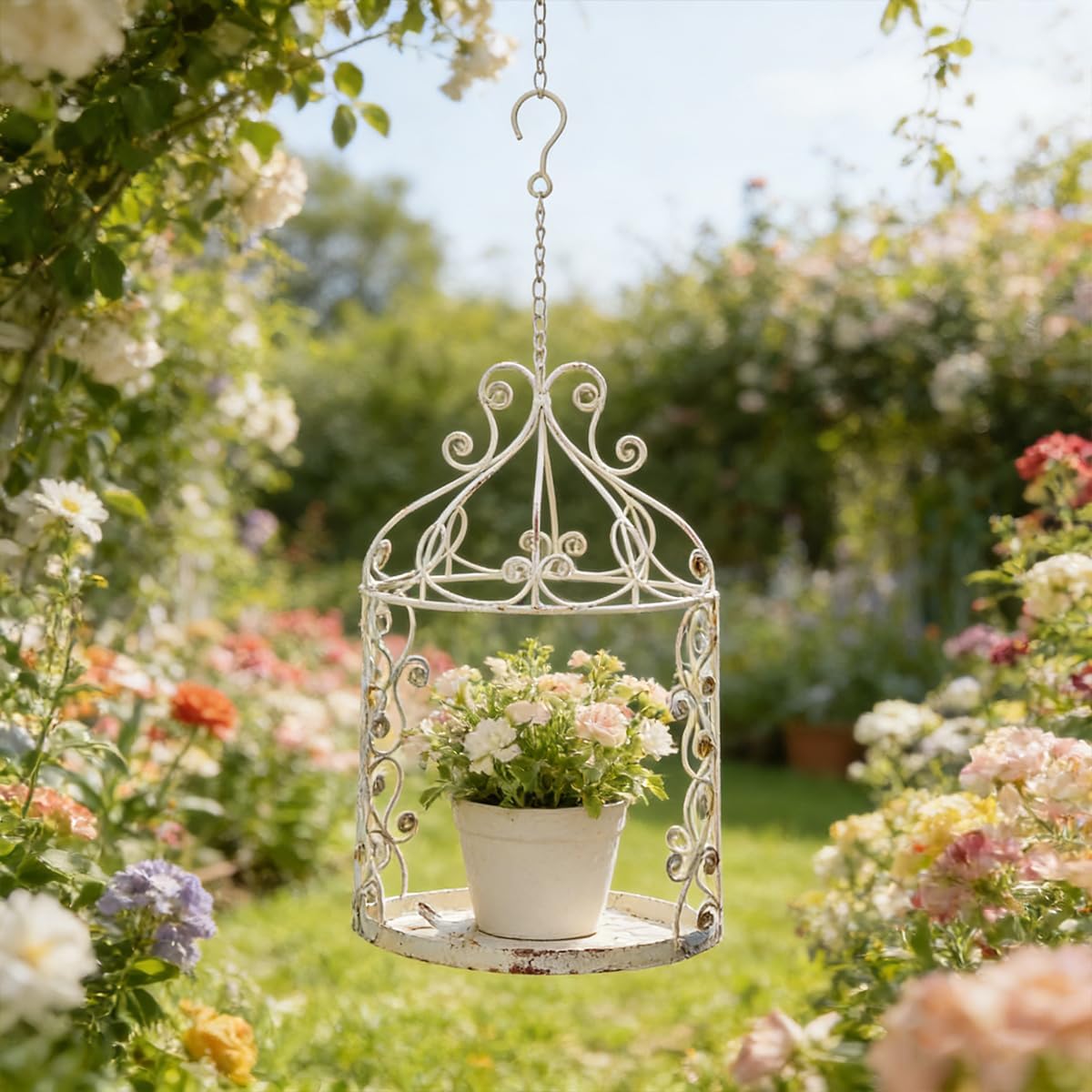 BOOMLATU Vintage Hanging Birdcage Planter, Distressed Iron Metal Flower Pot Holder Feature: Bring timeless charm to your home or garden with this vintage-style hanging birdcage planter. Crafted from durable iron metal and finished with a beautifully distressed look, this decorative birdcage adds rustic elegance and farmhouse warmth to any space. The open birdcage design allows you to showcase flower pots, faux greenery, succulents, candles, or seasonal decorations. Measuring 15.9 inches high and 9.84 inches wide, it’s the perfect size for hanging indoors or outdoors without overwhelming your space. Whether displayed on a patio, balcony, porch, or inside your home, this hanging birdcage planter creates a cozy, romantic atmosphere. Ideal for farmhouse décor, cottagecore styling, weddings, and special events. Specification: Size:Overall size:15.9 in (40.5 cm) height x 9.84 in (25 cm) Color: White Material:Metal Package: 1* hanging planter NOTE: 1.Specializing in plants and gardening 2.Please do not install in the unstable place,might happen to fall 3.Please be sure to use in a bearing area 4.Please confirm the installation position is often been well fixed 5.Please be sure to take in a windy weather